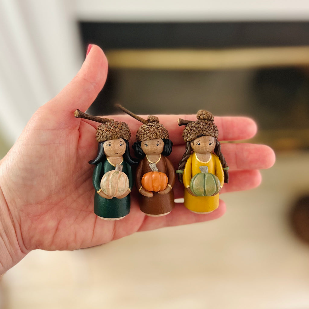 I have used polymer clay to hand-sculpt hair and arms holding pumpkins onto each piece. It brings delightful texture and dimension to my peg dolls and a more realistic look. Once sculpted, each piece is baked and sanded, then hand-painted and sealed with a matte protectant varnish.